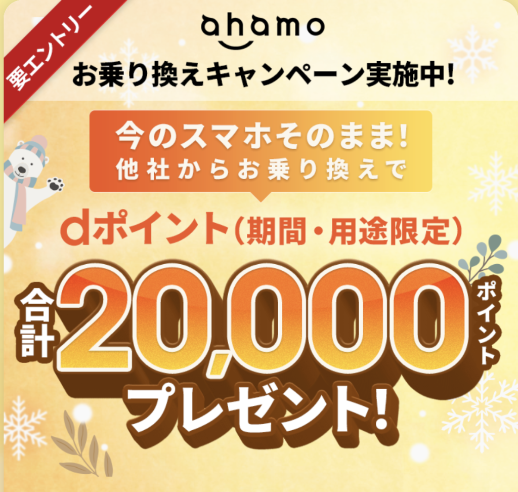 | ahamoへのお乗り換えでdポイントプレゼントキャンペーン | dポイント20,000ポイントプレゼント | 他社からの乗り換え | 未定 |