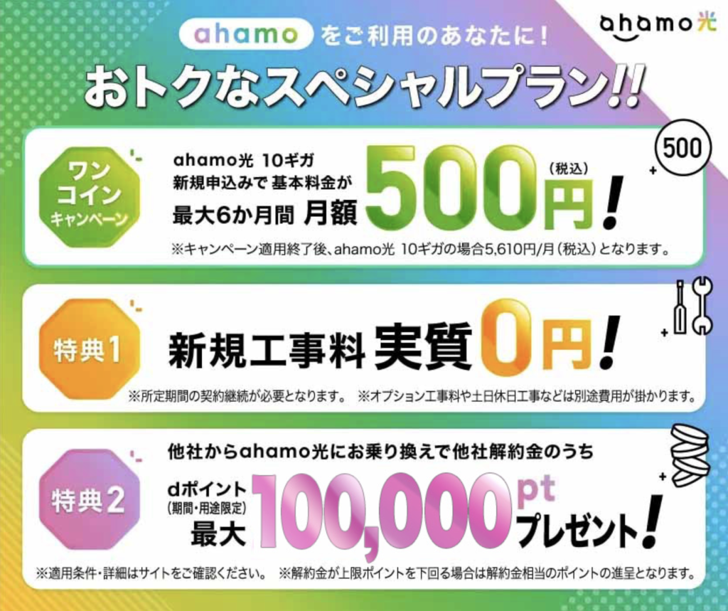 | ahamo光 ahamoユーザー専用の光回線 | ・10ギガプラン基本料金が最大6ヶ月間500円 ・1ギガプラン契約で10,000ポイントプレゼント ・新規工事費実質0円 ・他社違約金最大100,000ポイント還元 | 新規契約/転用/事業者変更/光回線再利用 | 未定 |