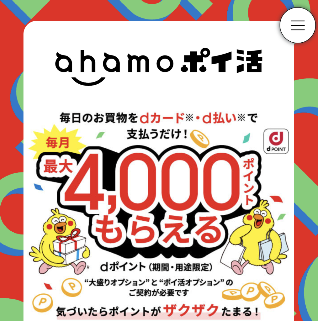 | ahamoのポイ活 | 毎月最大4,000ポイント還元 | プラン変更/新規登録 | 未定 |