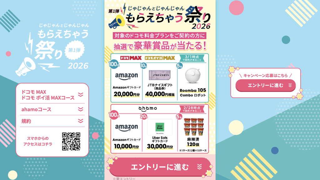 | じゃじゃんとじゃんじゃんもらえちゃう祭り2026~第1弾~ | 抽選で豪華景品が当たる | 新規契約/他社からの乗り換え/プラン変更 | 2026年2月2日〜2月28日 |
