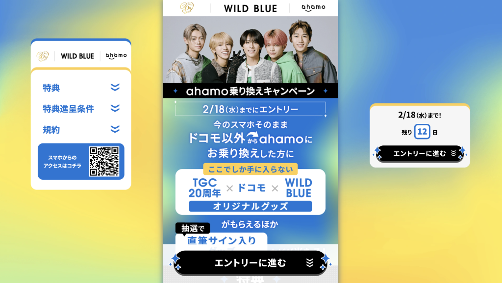 | TGC×WILD BLUE×ahamo乗り換えキャンペーン | ・メンバー撮り下ろし写真データ6枚分プレゼント ・5,000ポイントプレゼント ・抽選でオリジナルグッズが当たる | 他社からの乗り換え | 2026年1月9日~2月28日 |