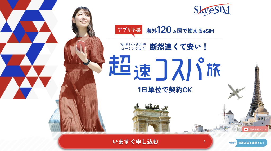 eSIMはWiFiレンタルなどと比べて、安価で手軽に使えるのが特徴です。
