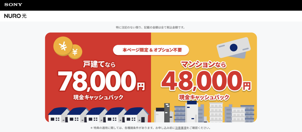 主なキャンペーン | ・最大2ヶ月間無料 ・マンション48,000円キャッシュバック ・工事費用実質無料 ・スマホセット割(ソフトバンク・ワイモバイル) |