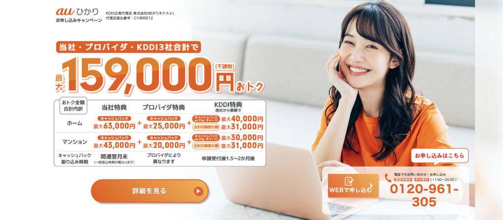 主なキャンペーン | ・最大159000円のキャッシュバック ・工事費用実質無料 ・スマホセット割(au・UQモバイル) |