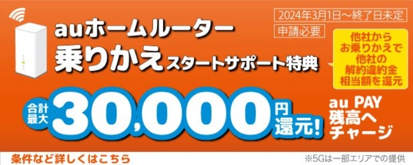 他社からauホームルーターに乗り換えるだけで、最大30,000円相当のau PAY残高が還元されるキャンペーンです。他社と比較しても高水準の還元額なので、普段からau PAYを利用する方にはおすすめです。