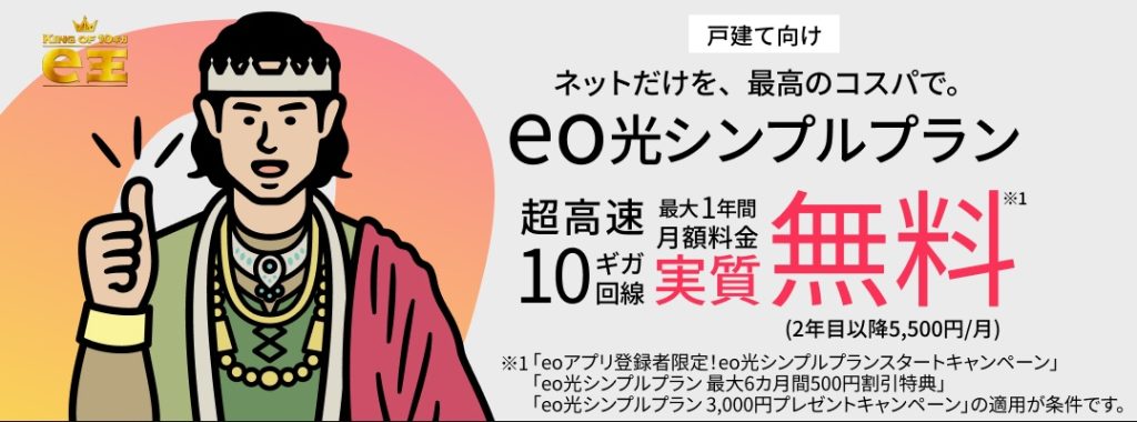 eo光では、現在2026年2月より、戸建て向けシンプルプラン(ネットのみのプラン)が最大1年間月額料金が無料のキャンペーンを行なっています。