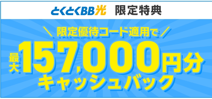 GMOとくとくBB光では申し込みの内容に応じて、最大157,000円ものキャッシュバックが受けられるキャンペーンをおこなっています。