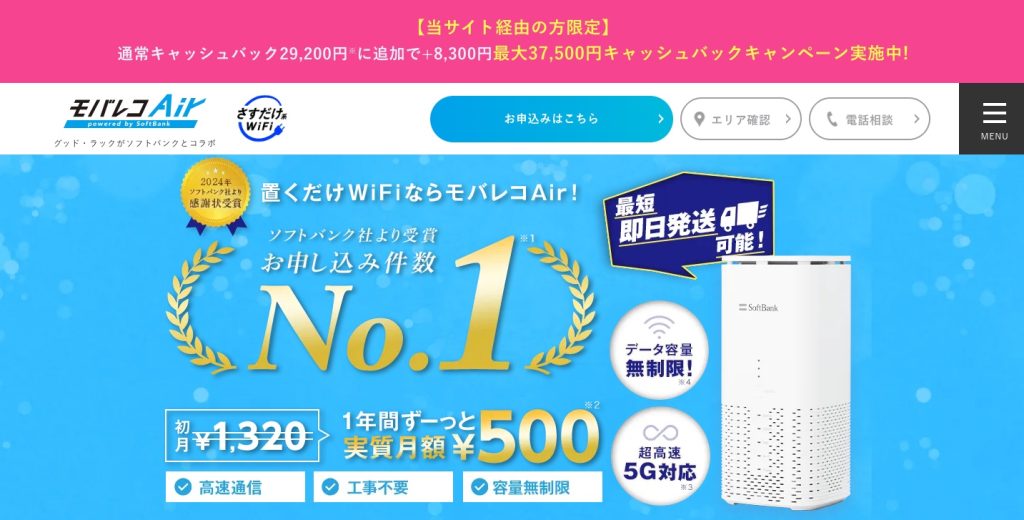 | SoftBank Air (提供エリア) | 5,368円 | ソフトバンク ワイモバイル | 71,280円 | 下り:93Mbps 上り:9Mbps | 全国 | 最大50,000円 |