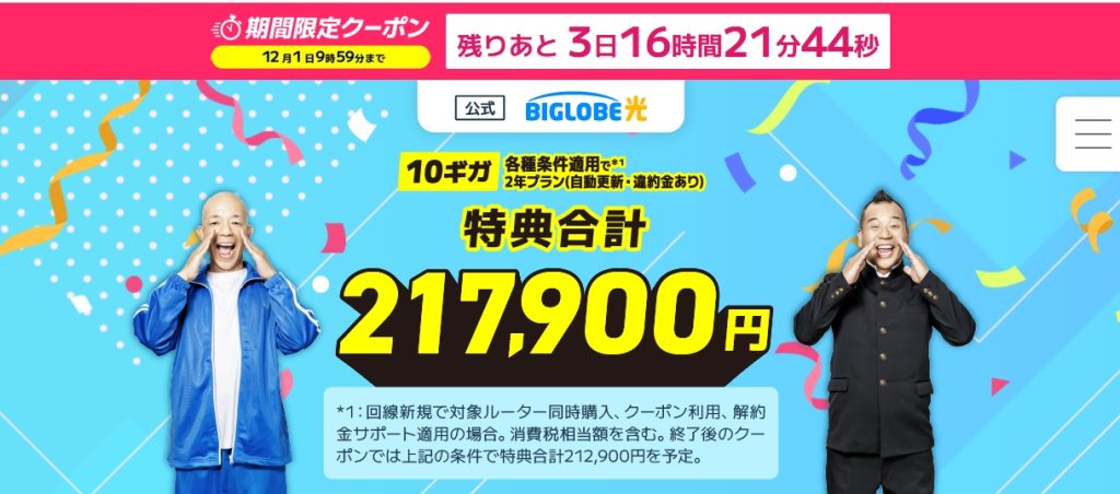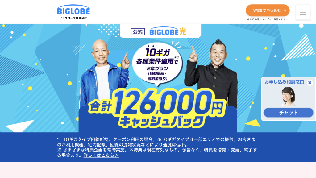 BIGLOBE光では、24ヶ月目までに最大126,000円(事業者変更時は105,000円)のキャッシュバックがありますので、かなり高額な内容となっています。