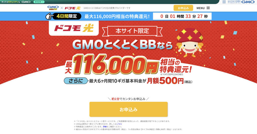 キャンペーン | ・最大116,000円の特典還元 ・最大6ヶ月目まで月額料金500円 ・ルーター無料レンタルあり |