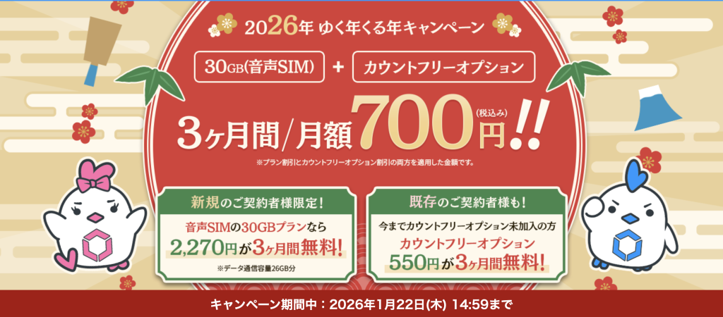 新規登録で音声SIM30GBプランが3ヶ月間割引、既存会員も月額550円のカウントフリーオプションへの新規加入で3ヶ月間無料となります。