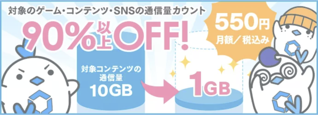 対象のゲームやコンテンツ、SNSの通信量カウントが90%以上OFFになるカウントフリーオプションや、ゲームと連携して特典がもらえるなど、他の格安SIMサービスにはない独自の魅力が満載です。