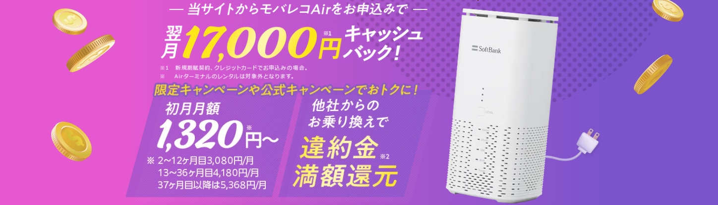 翌月17,000円キャッシュバック!月額料金も安くてお得 ・【オプション不要】17,000円キャッシュバック・月額1,320円〜 ※モバレコAirをお得に使いたい方は、必ず以下のキャンペーンページからお申し込みください。 最大17,000円キャッシュバック |