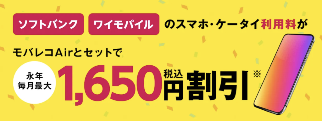 さらに、ソフトバンクまたはワイモバイルのスマホを利用している方であれば、毎月最大1,650円のセット割対象となります。