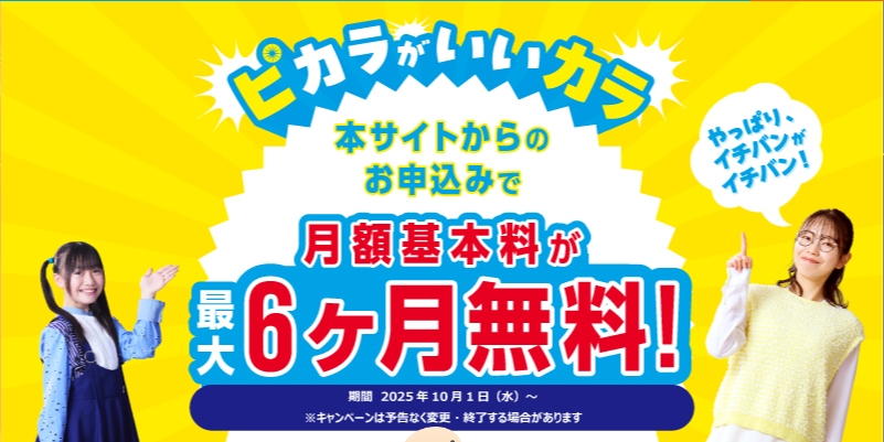 ピカラ光を契約すると、「光ねっと」「光でんわ」「オプション」の月額料金が6ヶ月間無料になるキャンペーンです。