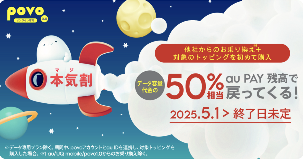 2026年2月現在、povoで実施中のキャンペーンの中で最もお得なのは「本気割キャンペーン」です。