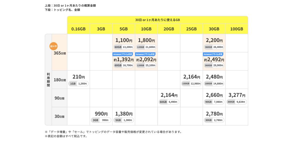 | トッピング料金(一例) | ・1GB(7日間):390円 ・3GB(30日間):990円 ・5GB(30日間):1,380円 ・60GB(365日間):13,200円 ・データ使い放題(24時間):330円 など1日間〜365日間、1GB〜無制限の範囲内での購入 |