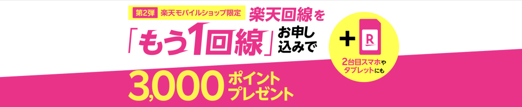 | 第2弾【ショップ限定】もう1回線お申し込みで3,000ポイントキャンペーン | 楽天ポイント3,000ポイントプレゼント | 他社からの乗り換え/新規登録/プラン変更 | 未定 |