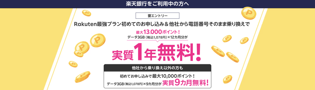 | 楽天銀行会員&他社からの乗り換え特典 | 楽天ポイント最大13,000ポイントプレゼント | 他社からの乗り換え/新規登録/プラン変更 | 未定 |