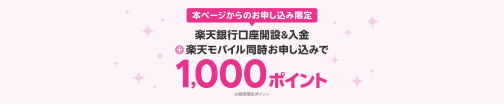| 楽天銀行口座開設&入金特典 | 楽天ポイント最大1,000ポイントプレゼント | 他社からの乗り換え/新規登録/プラン変更 | 未定 |