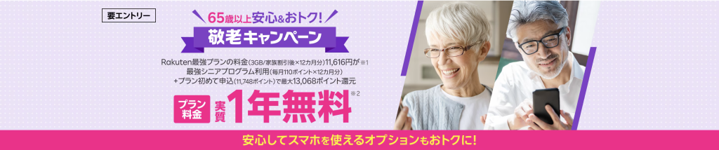「敬老キャンペーン」は65歳の誕生月以降に初めて楽天モバイルを契約すると、楽天ポイントが最大11,748ポイントもらえるキャンペーンです。