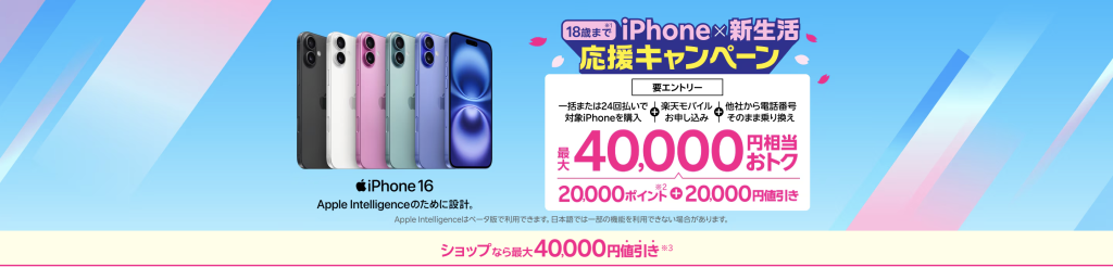 「新生活応援キャンペーン」は、18歳までの方が楽天モバイルに契約し、対象端末を購入することで最大40,000円相当の割引・ポイント付与がもらえるキャンペーンです。