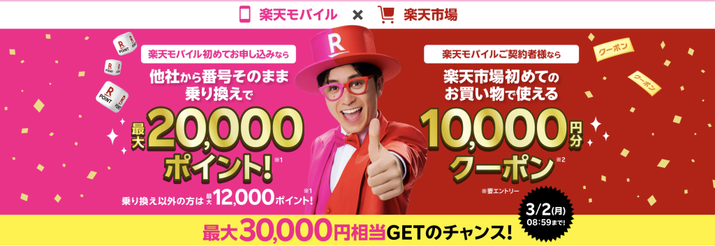 | 楽天モバイル×楽天市場 キャンペーン | 楽天ポイント最大20,000ポイント+10,000円分クーポンプレゼント | 他社からの乗り換え/新規登録+楽天市場でのお買い物経験のない人 | 2026年3月2日 8:59 |