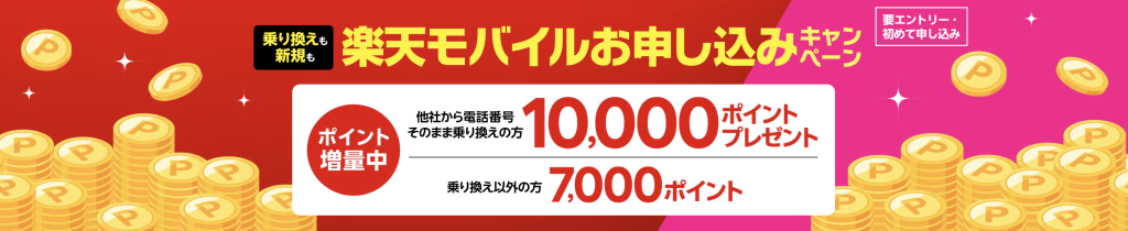 | 【Rakuten最強プランはじめてお申し込み特典】他社から乗り換えでポイントプレゼント | 最大10,000ポイントプレゼント | ①エントリー ②他社からの乗り換え ③利用開始 ④Rakuten Linkアプリから発信で10秒以上通話 | 利用が確認された月の翌々月末日ごろから3カ月間 |