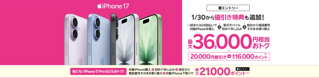 - 他社から乗り換えでRakuten最強プランご契約とiPhone対象製品を一括払いもしくは24回払いのご購入で割引キャンペーン(キャンペーンコード:2568)