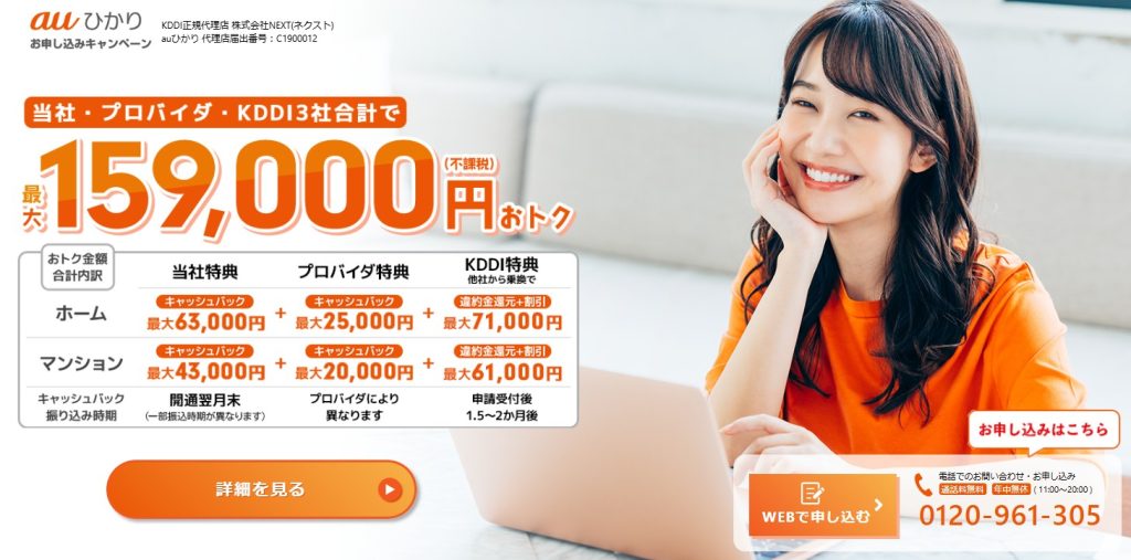 auひかりは、au・UQモバイルのスマホセット割が使える独立回線で、混雑しにくく安定した速度が出やすいのが特徴です。特に戸建てでは評価が高く、違約金相当額の還元キャンペーンも充実しています。