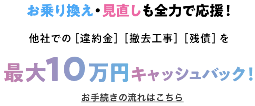 Wi-Fi革命セットなら、他社からの乗り換え時に発生する違約金、撤去工事、残債金の満額キャッシュバックが受けられます。