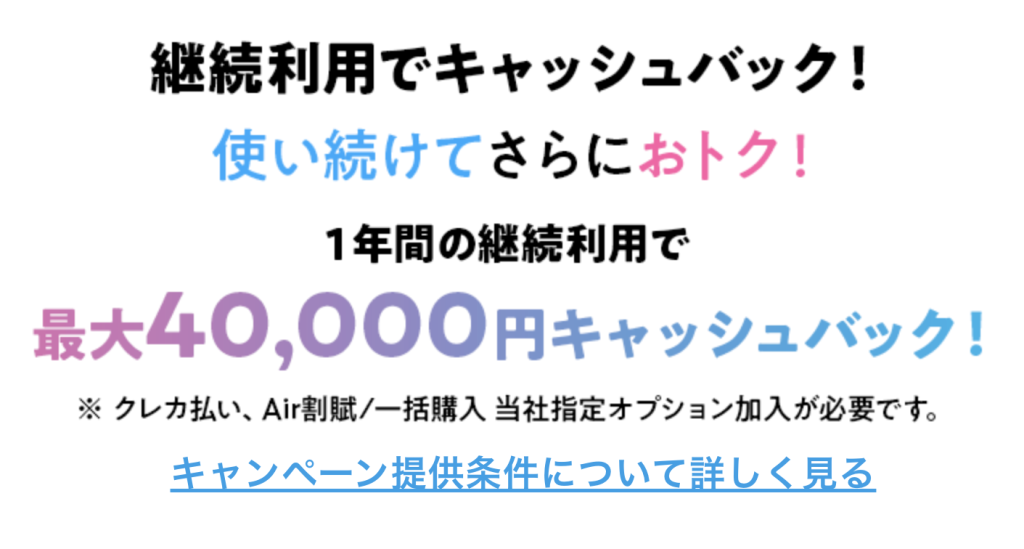 | キャッシュバック | 1年継続:最大40,000円 他社乗り換え費用:最大100,000円 ※キャンペーン条件あり |
