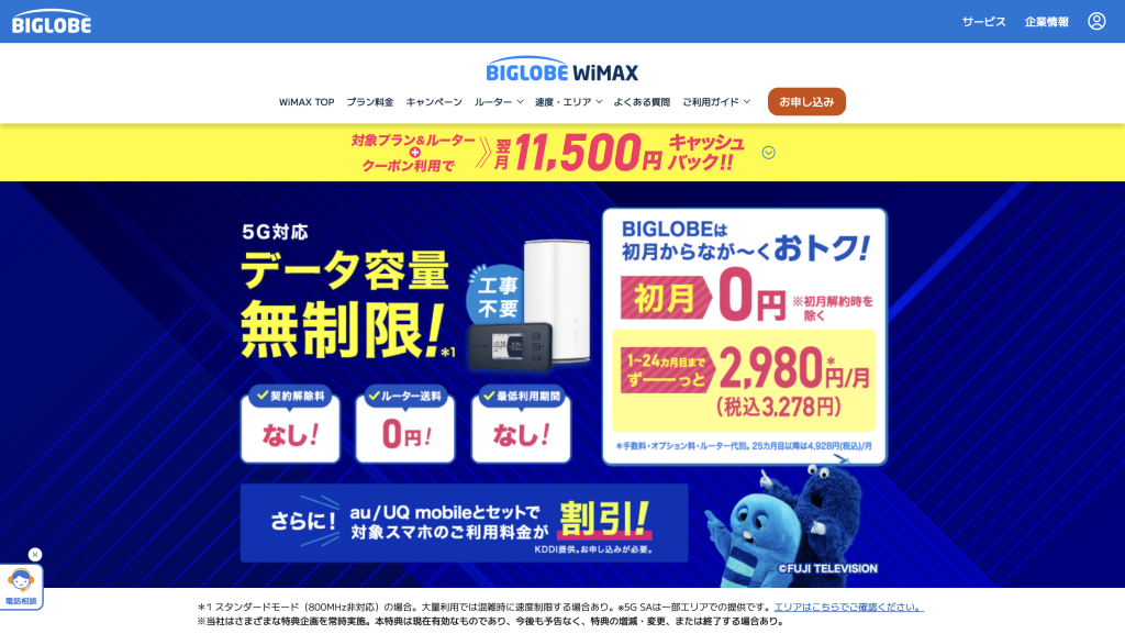 元々月額料金が安いBIGLOBE WiMAXですが、11,500円のキャッシュバックが受けられるため、実質料金が比較的安いプロバイダでもあります。
