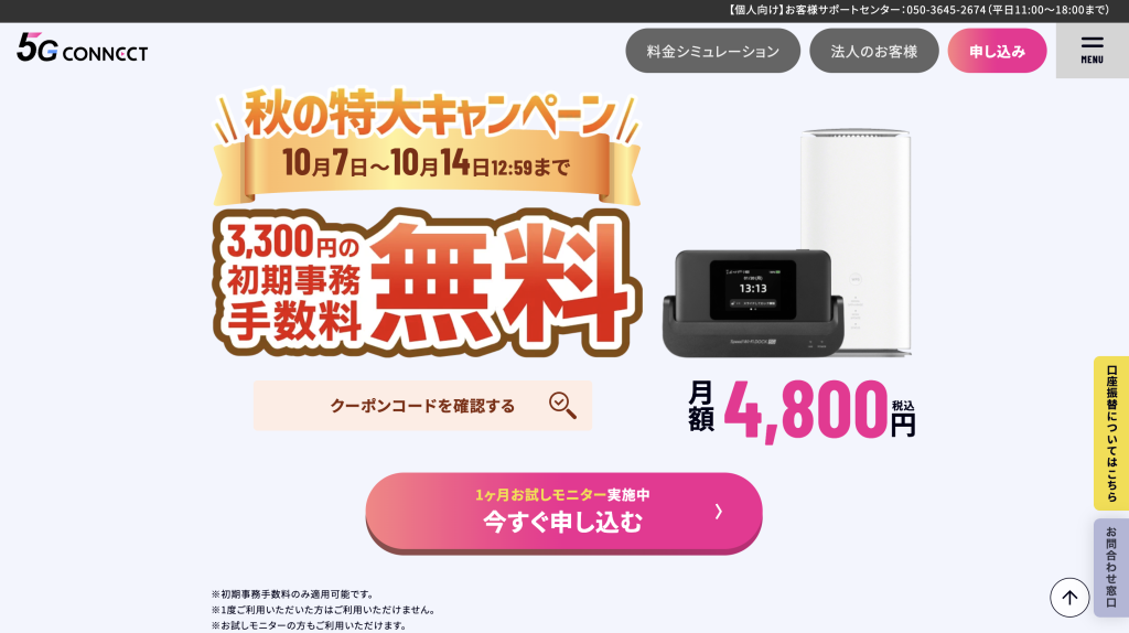 5G CONNECT WiMAXでは初月だけでなく3ヶ月ごとに月額料金が無料となるキャンペーンを実施しています。