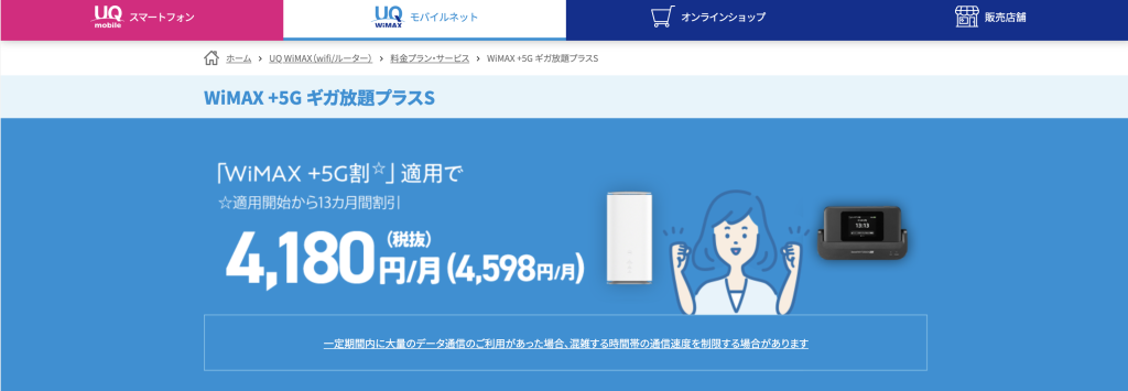 UQ WiMAX現行プランは「WiMAX +5G ギガ放題プラスS」は、月間容量制限や3日間制限がなく、快適に利用できるプランです。